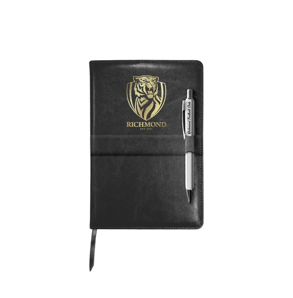 Richmond Tigers Team Logo - PU Leather Notebook with pen strap- Metal High End Pen with team text and black ink- Official AFL Merchandise