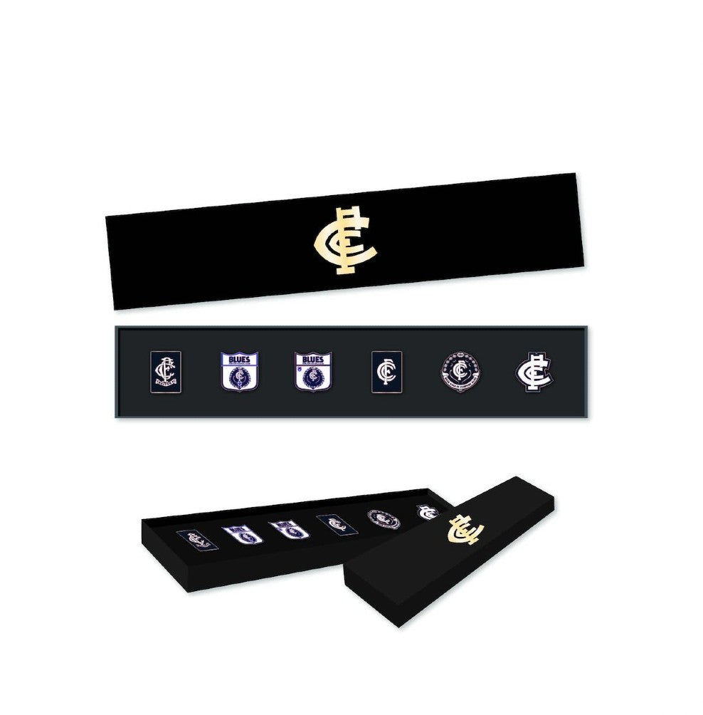 Here's a great collection of classic memorabilia to add to your fan gear - a Boxed Set of 6 Carlton Blues Metal Pins.