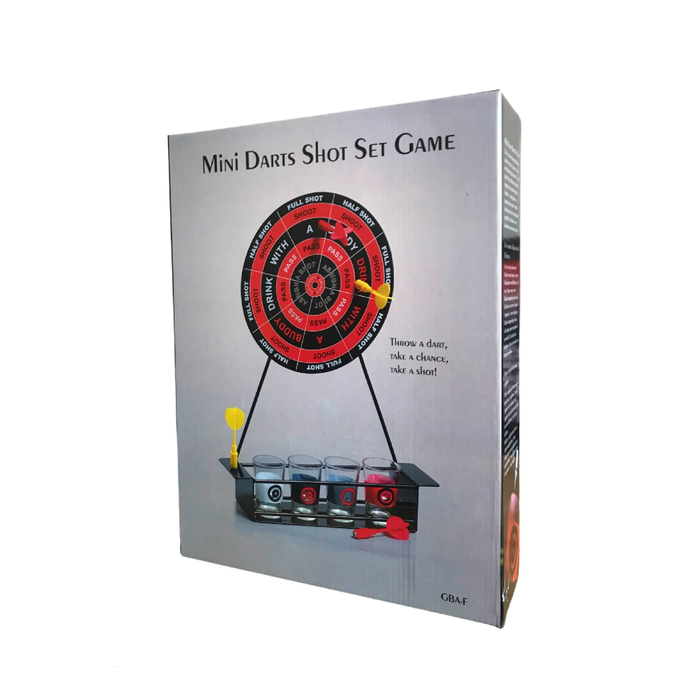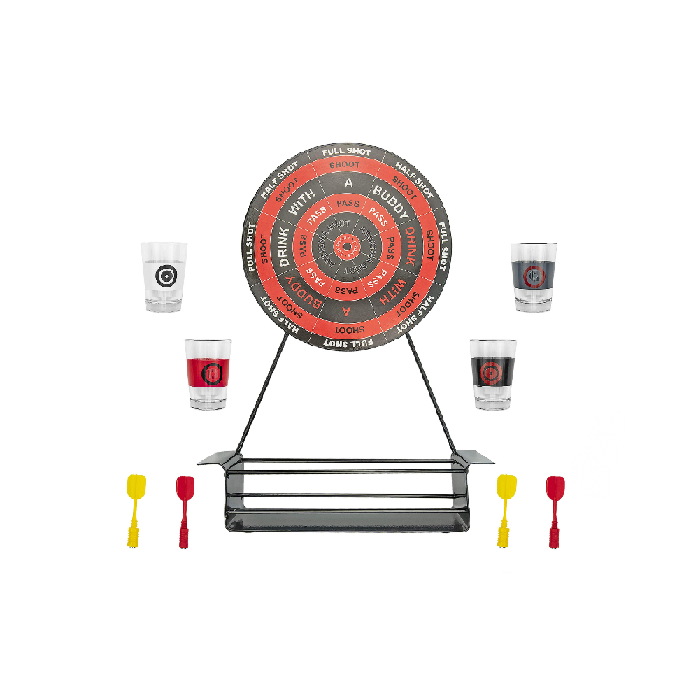- A full set! - This game set includes metal dart board, 4 plastic magnetic darts, and 4 shot glasses. Just BYOB!